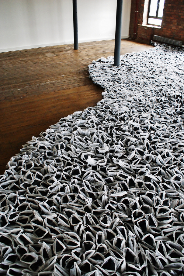 Installation artist Robyn Woolston works with 'waste' and found objects to create awesome sculptures. Like the one above using 45,000 plastic bags to completely reimagine physical spaces. The piece below utilizes Financial Times pages, children's fairy tale images and 241 reclaimed lanyard wallets. Robyn has been the subject of several gallery shows and residences.