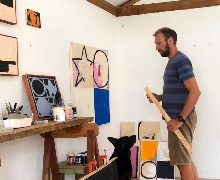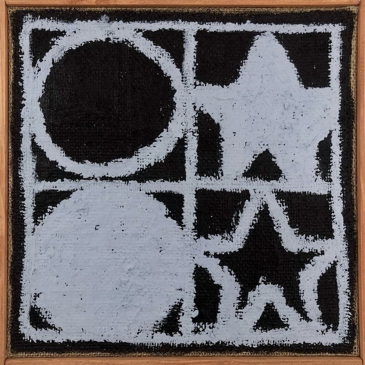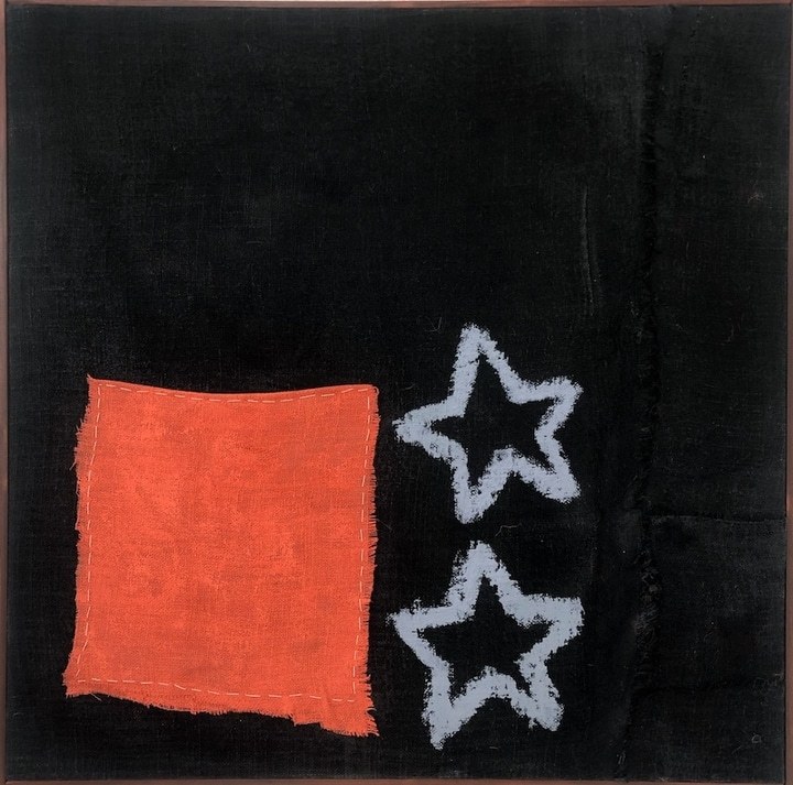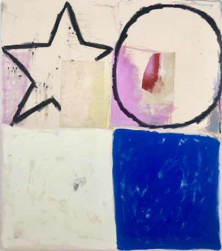 Each work is divided into four sections. Textured edges emphasise process over finish, suggesting a modular, almost provisional logic. Upon viewing, my experience is one of comfort. There is something resolutely calming about the stars and circles that sit contentedly in their respective boxes, and the earthy humanness that emanates from the fraying material, like loose threads from a beloved, well-worn jumper. “These are the paintings I’ve always wanted to make,” Peter Evans tells me. “I don’t like work that’s overly didactic. I don’t want to dictate your experience of my work. Art should remain open to interpretation.”